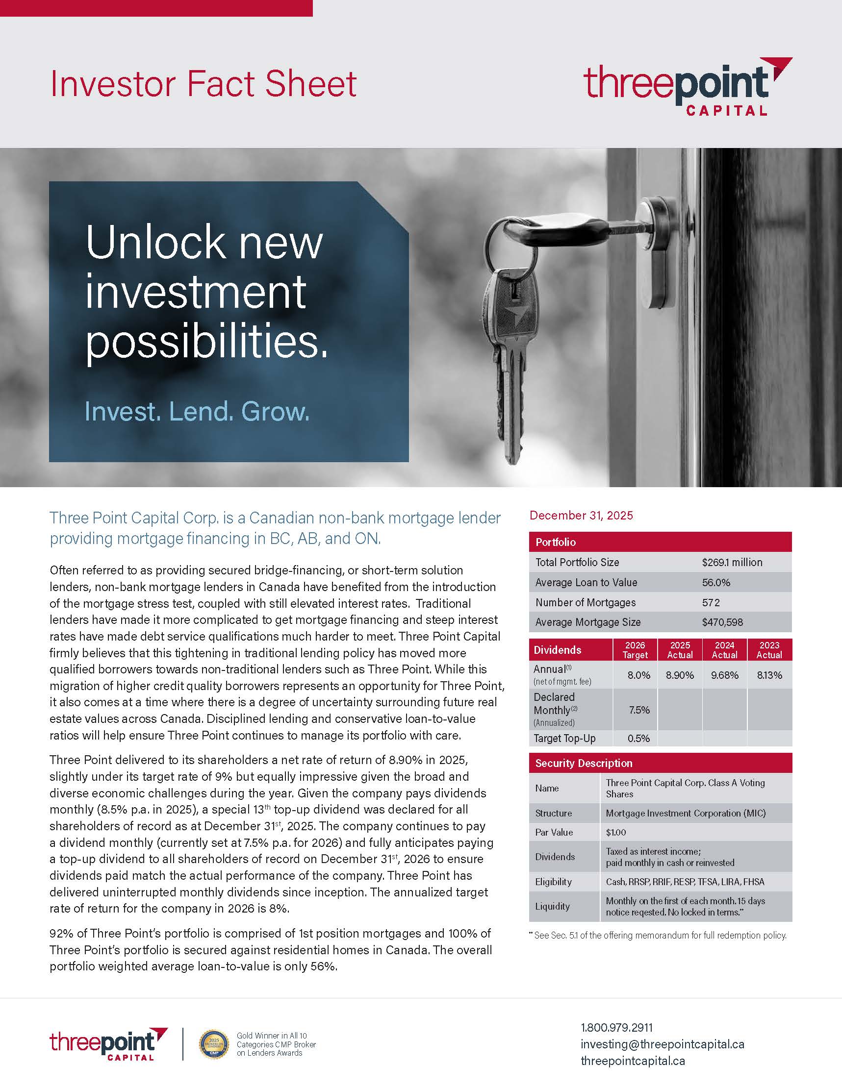 Three Point Capital Corp. is a Mortgage Investment Corporation (MIC).